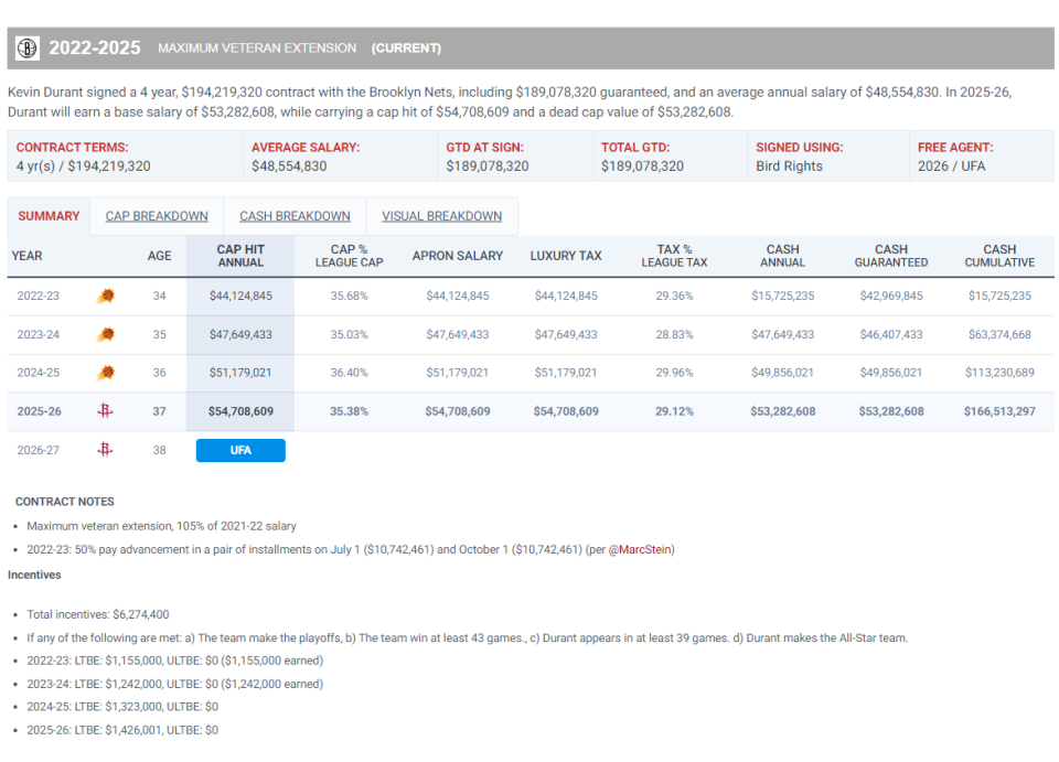 根据此前薪资结构专家鲍比-马克斯的消息,杜兰特今夏可以跟火箭续约一份两年价值1.22亿的顶薪(受限38岁条款只能签两年),如果等到2026年一月工资帽再度上涨后他可以签下一份两年1.24亿的顶薪。